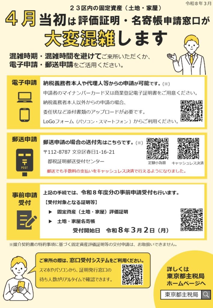 詳細は東京都主税局ホームページ「令和8年度分 固定資産(土地・家屋)評価証明、土地・家屋名寄帳事前申請受付のお知らせ」